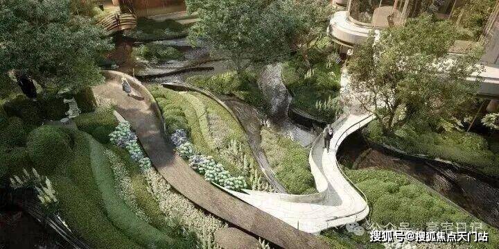 板上:“悬浮花园”住宅区,住宅组团如浮岛花园悬浮在城市之上,真正意义上实现人车分流和立体绿化,隔绝噪音、尾气、潮湿