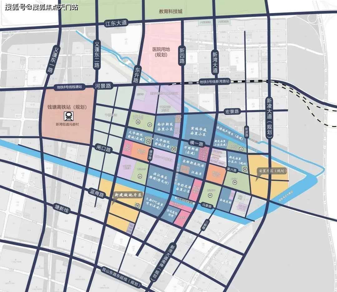 【学校配套】:项目西侧约800米新湾第二幼儿园(公办),西南侧约800米新湾小学(公办,百年名校),南侧约100米是新湾初中(公办),东侧约50米为杭四中大江东分校(杭州市重点中学,在建)