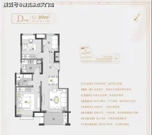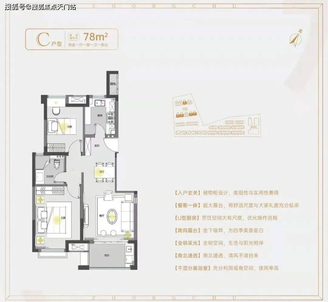 建面约78㎡2房1卫户型,做到了双开间朝南+南北通透+卧室带飘窗+动静分离,功能区划分、动线都非常清晰。
