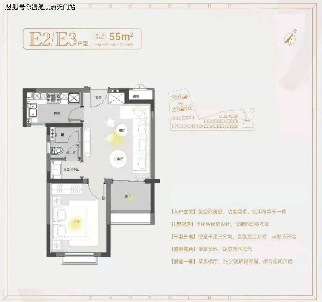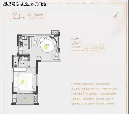 建面约55㎡1房1卫户型,低总价优质上车小户型,做到了双开间朝南+卫生间干湿分离+卧室带飘窗+客餐厅相连,小而美的一个户型。
