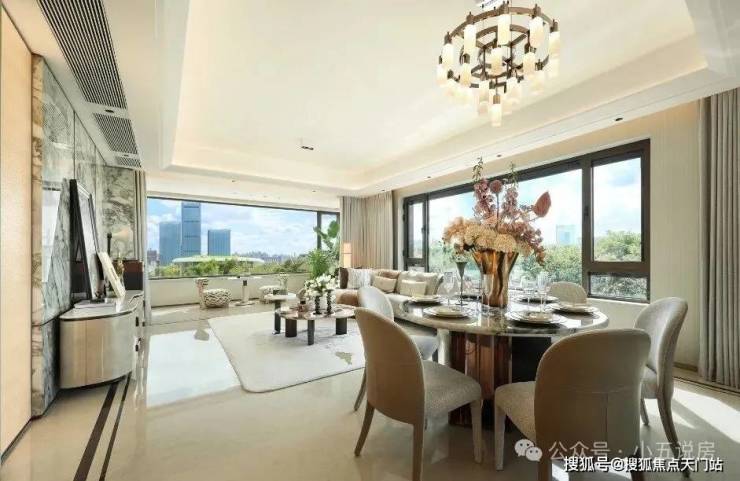 超16米的连续景观面:客厅、餐厅甚至主卧等主要房间都能享受到这一视野,整个家的采光和观景效果极佳。