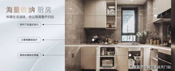 橱柜收纳系统:特别预置洗碗机点位、柜内下拉篮式设计、不锈钢挡油板、柜下操作灯、烹饪全流程功能动线一体化设计;