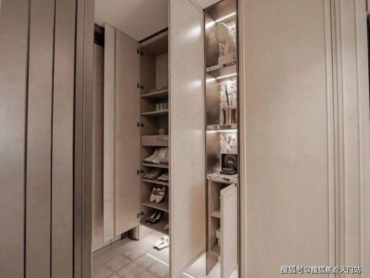 以137㎡户型为例,进门右手边是一门到顶的玄关柜收纳,转角之后,还有一个进深约60cm的豪华收纳,可以用来收纳业主的行李箱、童车、平衡车等等。
