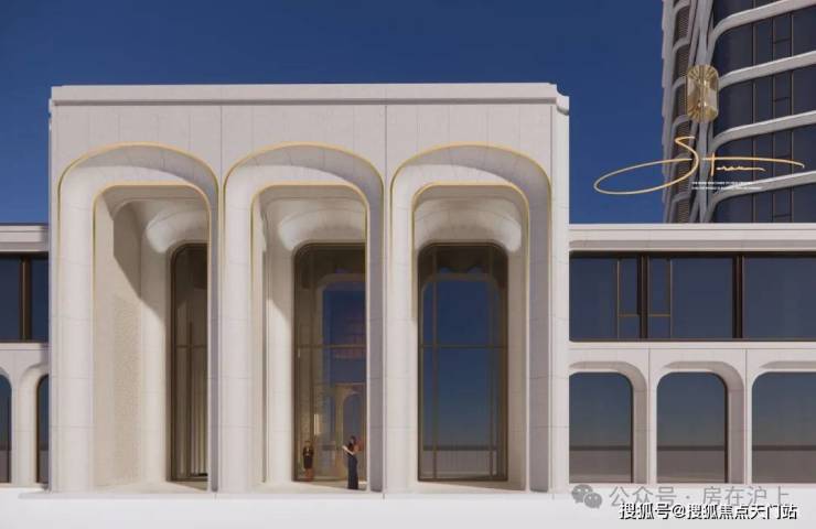 主入口汲取礼查饭店“孔雀厅”的同心拱元素,结合路易斯·康金贝尔美术馆的拱形语言,打造穿越时空的优雅符号。