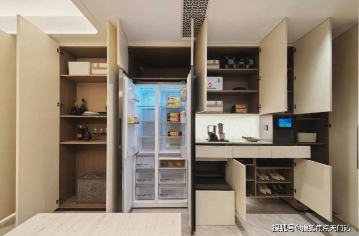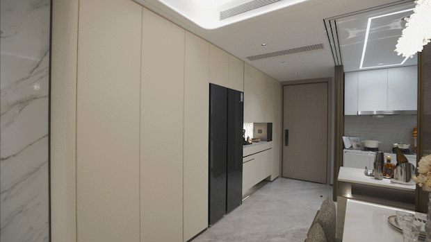 值得一提的是,入户玄关设置 一整面的玄关柜空间左侧分户墙处增设“凹型空间" , 预留内嵌 双开门 冰箱空间 。