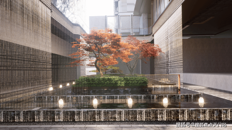 下沉庭院 整体长约18米,进深约9.5米,庭院的上下景观通过水帘相连通,中间结合有着层层叠水的水景,搭配水晶砖的景墙,将品质感拉满。