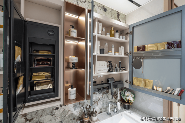 看不见的巧思——立体收纳系统:项目层高达到3.1-3.3米,借此优势创新打造了“竖向收纳”体系,通过顶部储物柜、机舱式高柜等设计,将垂直空间利用到极致,小户型也能拥有大宅的储物容量。