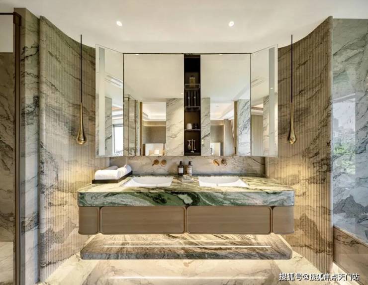 万科中興傲舍凝聚72种高端豪宅都难得一见的奢材 ,如皇家白奢石、Prada绿皮革面奢石、砖纹定制铝板等等,每一处细节都透露出精致与考究。