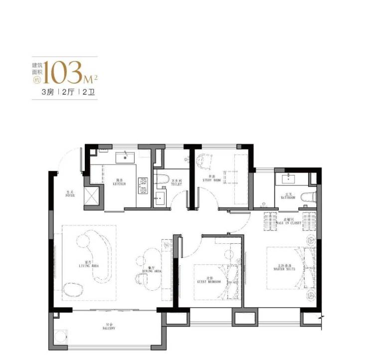 产品:103㎡、107㎡的三房两厅两卫及123㎡、129㎡的四房两厅两卫