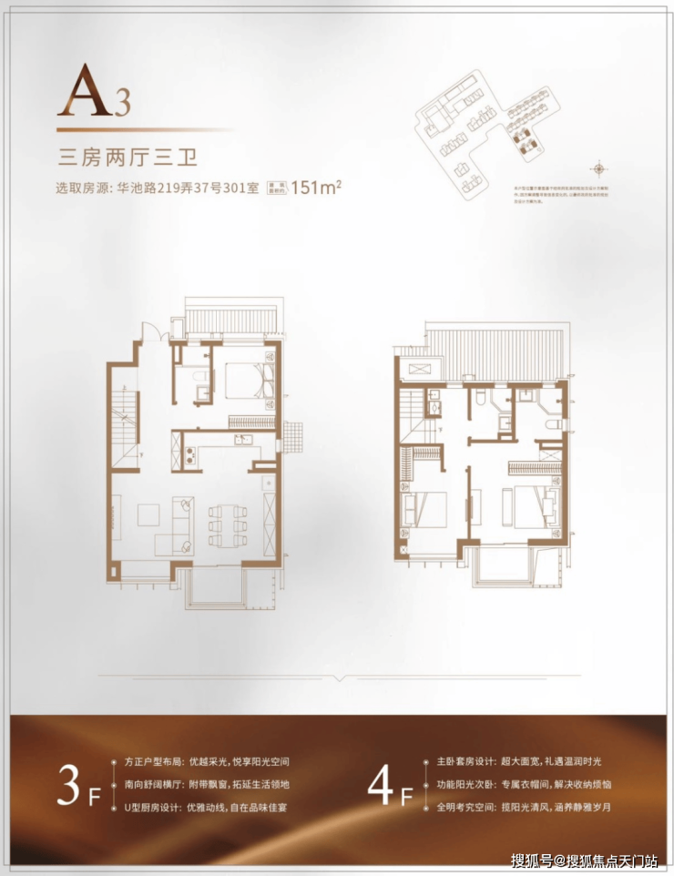 叠墅户型则提供更阔绰的居住空间,如建面约155㎡的下叠A2户型,为四房两厅三卫设计。