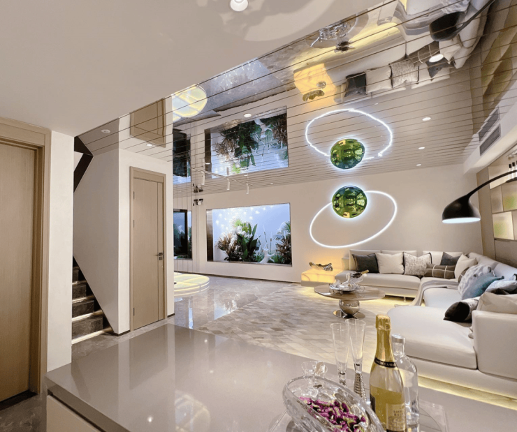 项目为毛坯交付,但建筑风格融合了海派元素与国际高奢品牌灵感,采用仿石多彩涂料、局部金属线条装饰,并搭配大面积玻璃幕墙,打造极具质感的现代主义美学立面。