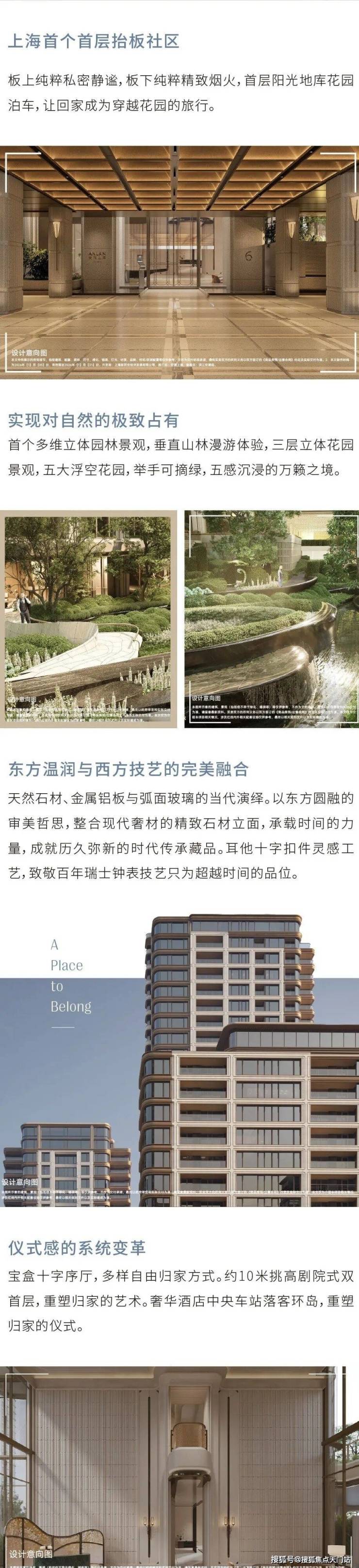 作为上海新规之后首个重点落地项目,安澜上海首创"全域抬板"规划,通过将居住空间整体抬升,创造出动静有序的生活空间。板上,是纯粹私密的住区;板下,是高定丰盛的配套场域。并结合抬板设计所形成的空间条件,构建出多维立体的空中生活场域。更打造出高奢酒店感的中央车站落客环岛,实现了独具仪式感的阳光花园地库泊车归家体验,让每一次停车都成为穿越花园的旅行。