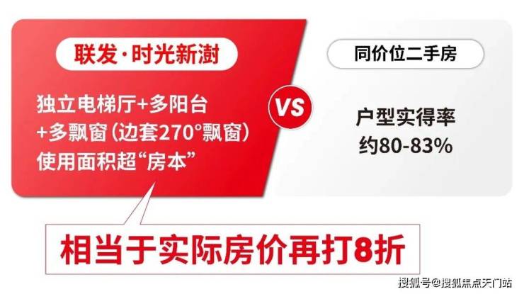 目前市面上这个价位的二手房实得率基本在80%左右,而联发·时光新澍,多阳台+多飘窗+独立电梯厅,可用面积远超“房本”,折算下来实际单价相等于再打8折!