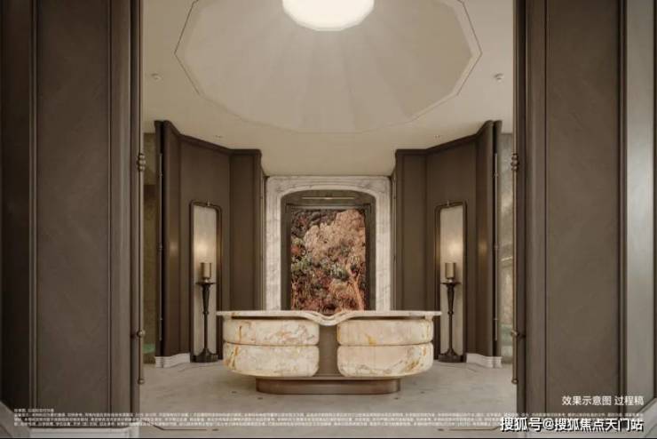 弧形仿石铝板勾勒立面层次,门厅、柱体、台面皆以柔弧过渡,不同材质成多倍投入以达最佳效果,打造温润高贵、典雅内敛的独有气质