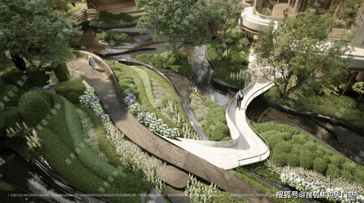 项目拥有罕见立体景观“城市山林”社区,在全域抬板约4米的基础上,项目又下挖,形成罕见垂直落差。依托这一独特地形,项目打造“沿街古树花园+板上浮空花园+板下流石花园”的多层立体景观体系。