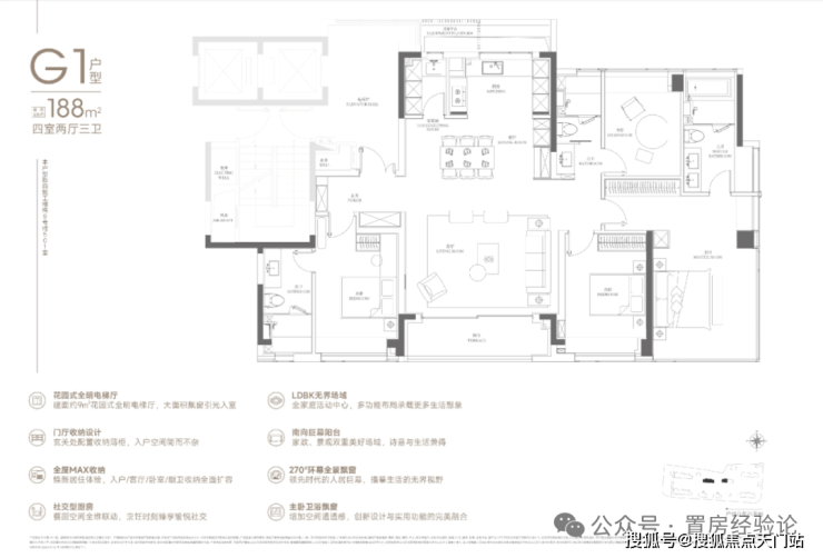 188户型2梯2户,有独立的电梯厅。4房3卫设计,还是3明卫,这两点还是不错的。