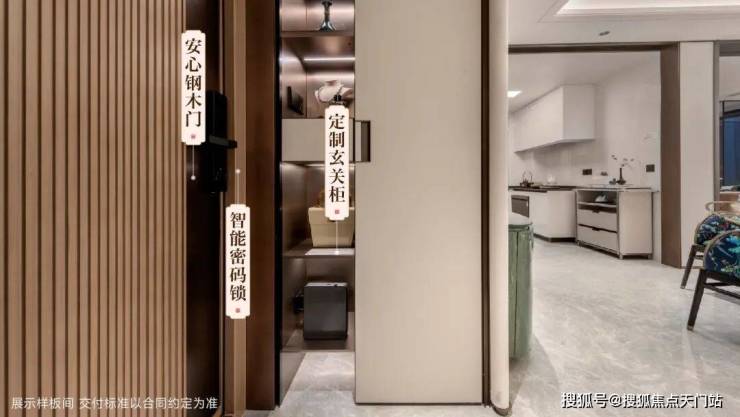 入户门选用钢木复合防盗门,坚固耐用,防火、保温亦可隔声, 搭配智能密码锁,多重开启功能,贴心守护居家安全。定制玄关柜,巧妙集合收纳、置物等功能,缔造从容生活体验。