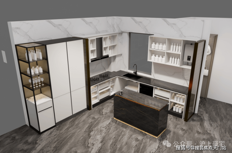 看到约143平户型,厨房岛台和上柜都不稀奇,厨房外的半开放式餐边柜和利勃海尔内嵌式同样也作为交付标准附赠,柜体额外提供接近1立方面积的收纳空间: