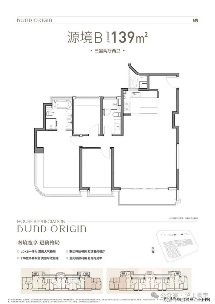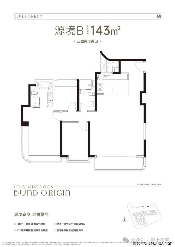 B户型是3房2厅2卫格局, 三开间朝南+LDKB一体化+奢阔宽厅+全卧室带飘窗+主卧套房设计+动静分离+主卧270度飘窗,舒适度更高。
