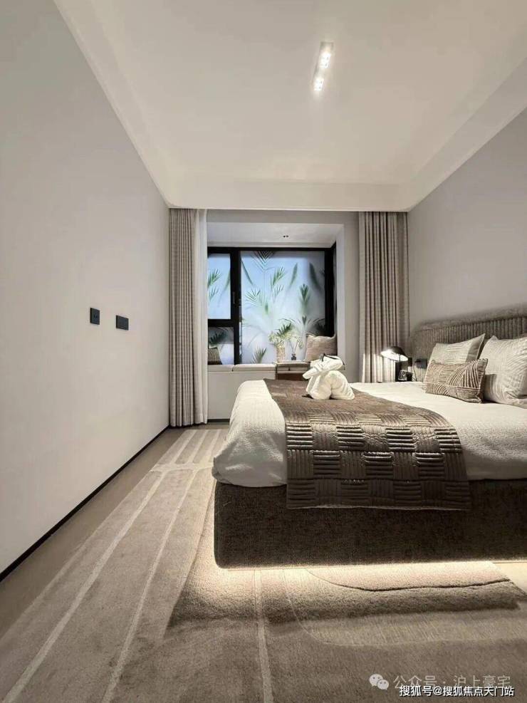 主卧和约99平户型一样,衣柜更大形成衣帽空间,还交付有半开放式、类似于酒店的迷你吧设计: