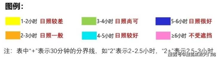 表中每户日照时间取南向主要房间作为代表,即南向如果有客厅和卧室,则选取客厅日照时间作为本户日照时间;如果南向无客厅,只有主卧和次卧,则选取主卧日照时间作为本户日照时间。