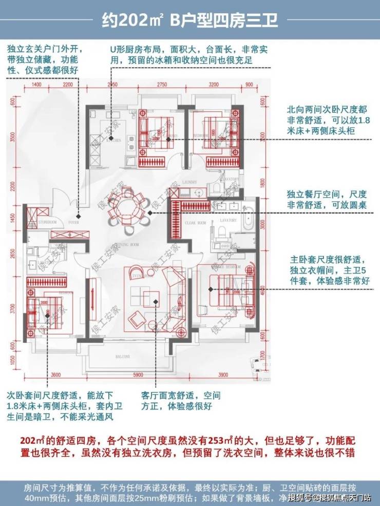 综合评价:202㎡的舒适四房,各个空间尺度虽然没有253㎡的大,但也足够了,功能配置也很齐全,虽然没有独立洗衣房,但预留了洗衣空间,整体来说也很不错