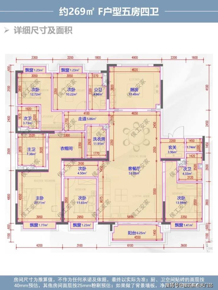 综合评价:269㎡五房,因为面积够大,做5房各个空间尺度也依然很舒适;三间套房,配置非常不错,独立玄关、超大厨房、独立家政间,各方面配置都非常不错,面积达到一定程度,户型怎么做都不会太差