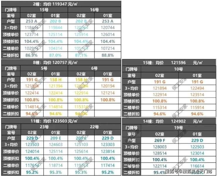 顶层单价与3+均价对比,2幢折扣率约104.4%,性价比不高,其余楼栋折扣率约100.4%~100.8%,性价比很高(通常100-103%左右性价比比较高);