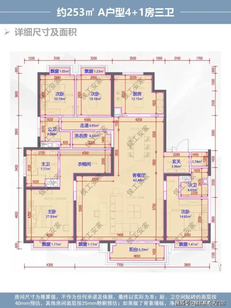 综合评价:253㎡的舒适4+1房,南向四面宽,各个空间尺度都很充足,功能配置也很齐全,还有独立的家政间,虽然次卧套卫生间是暗卫,但三卫有一个暗卫也属正常,整体来说户型还是非常不错