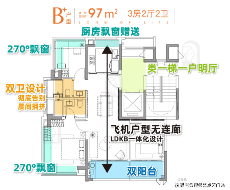 2.建面约97㎡3房2卫,南向双阳台+全飘窗+270°飘窗,平衡预算与舒适度的首改王者