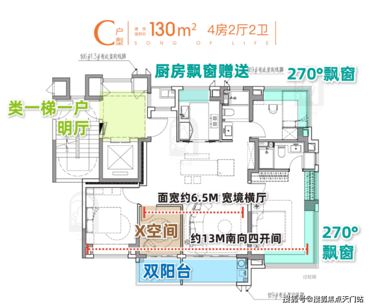 3.建面约 130㎡4房2卫:四开间朝南+可变横厅+双阳台联动,一步到位的改善标杆