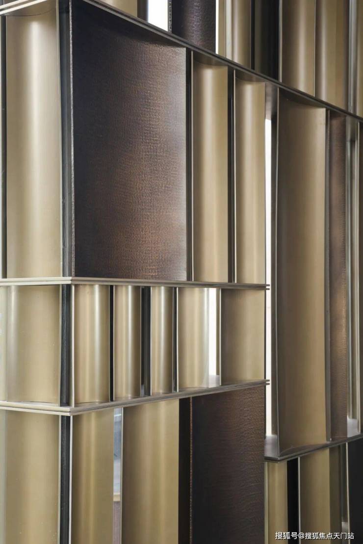 顶部定制发光云石亚克力与圆弧形的古铜色铝板交相辉映,8个西班牙宫殿沉香米黄石柱提升了尊崇感 ,漫步其间,揽风入怀,树影斑驳映入眼帘,水声潺潺入耳,归家的轻松感油然而生,笔者随手一拍,都非常的出圈。