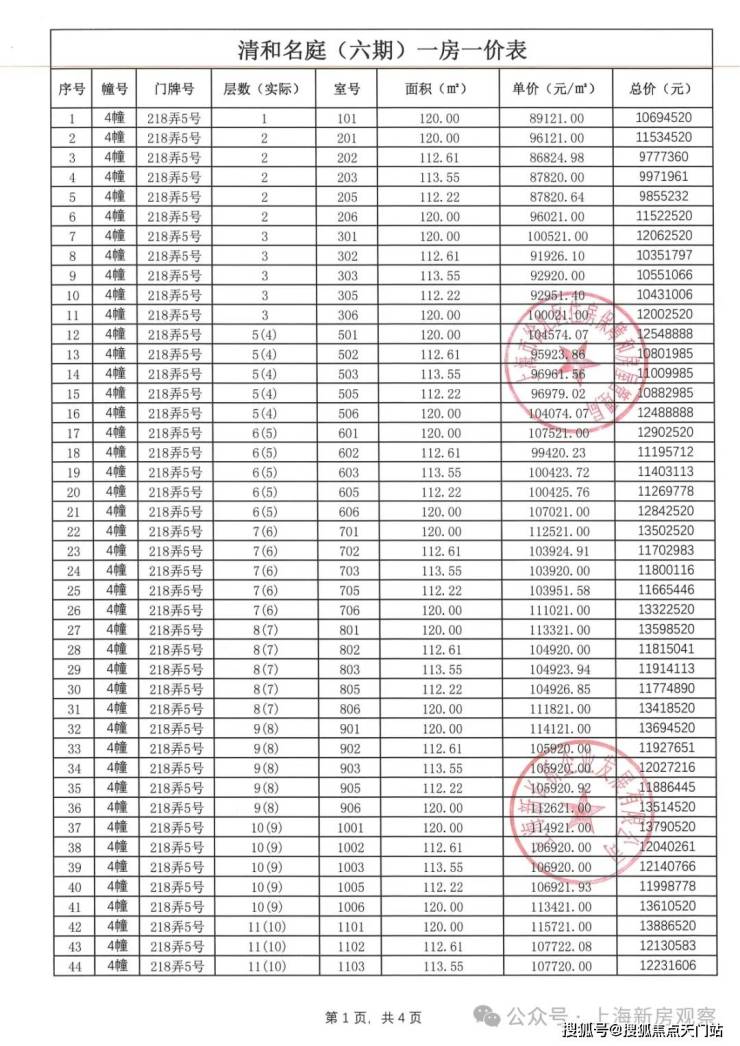 一房一价表如下