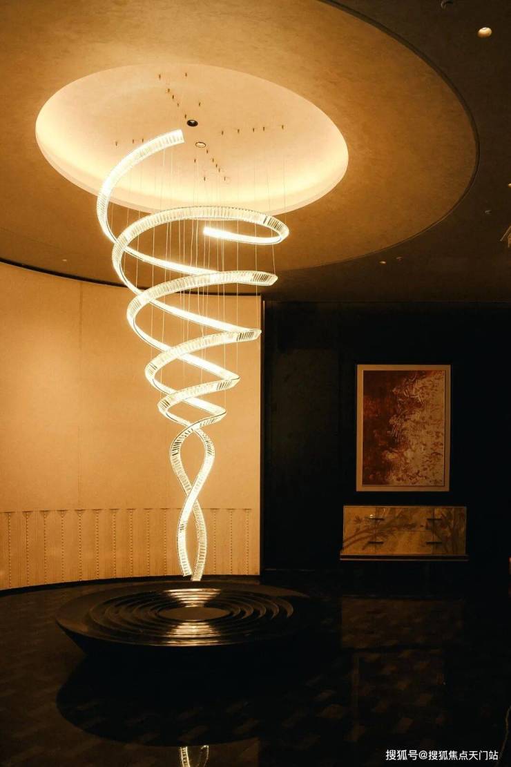 入口阶梯的左右两端的景观灯具,由伊朗奢石“白雪公主”打造,石体历经1.3亿年沉淀,灯光通透,雪色中鎏金细纹交织,如同写意山水画中的留白与流