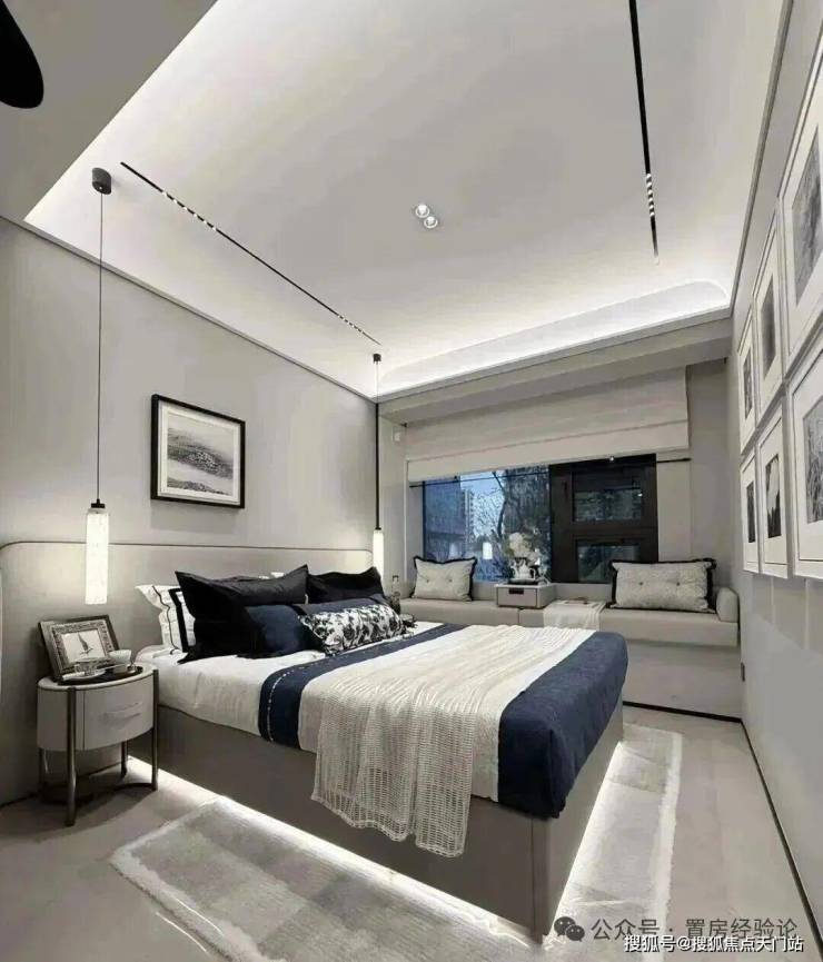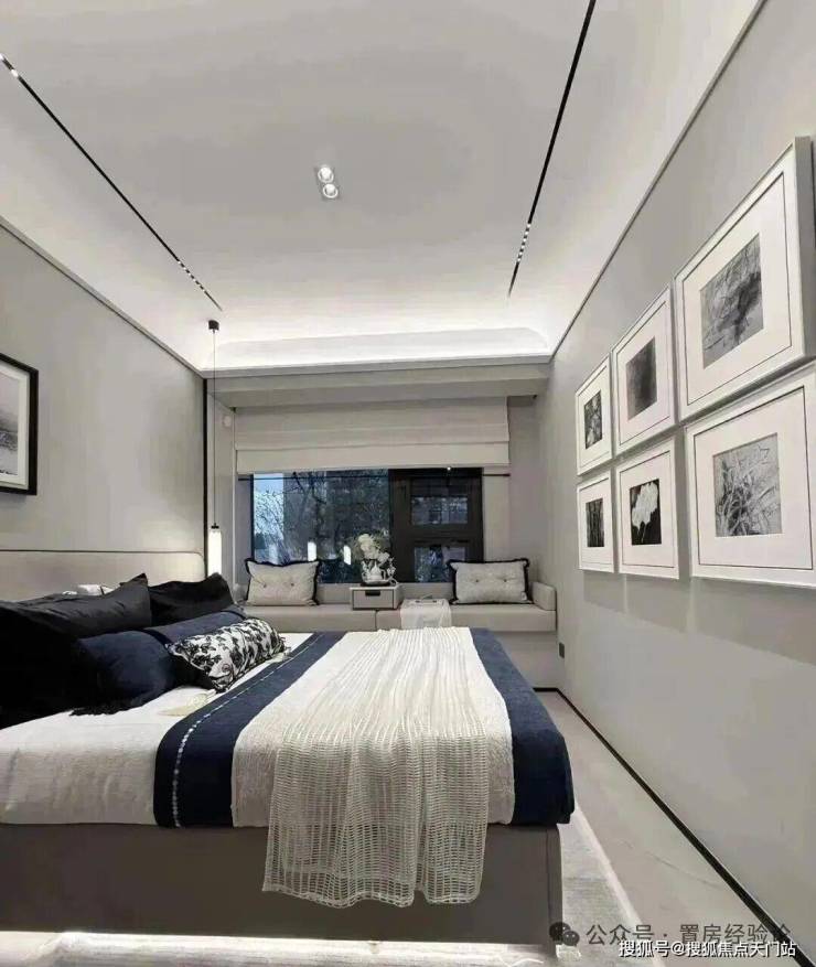 主卧转角落地窗+飘窗,也算是非常少见的了。净面宽约3.6m,不算进门的衣柜,进深大约5.7m左右。根据测算,可以放置宽约2m的床+2个床头柜(宽度约45cm/个)是可以的。