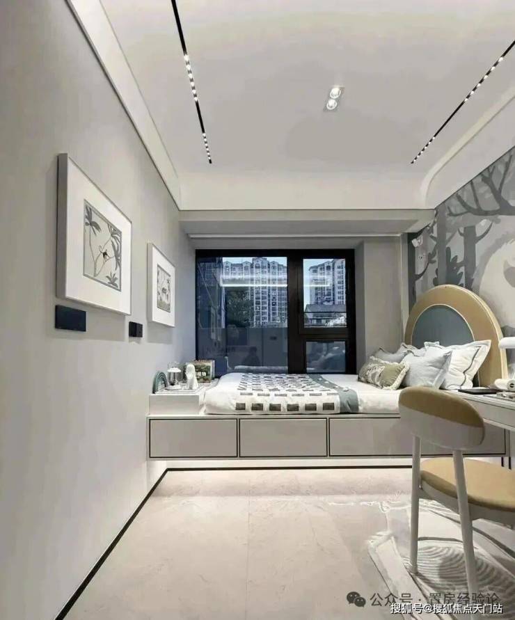 其中主卧的270°转角飘窗就有约5.7m²,通过与外立面的结合,直接做了梳妆台和储物柜,拓展了飘窗的实用性。