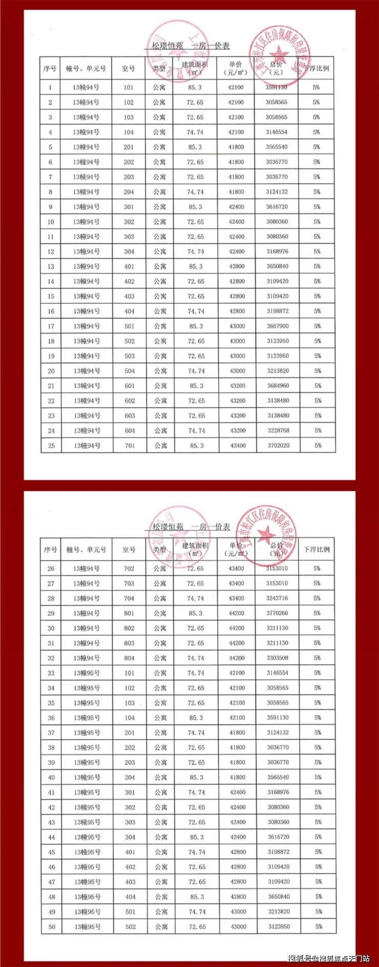 上期一房一价表如下: