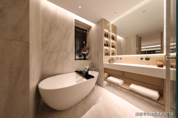 主次卫内的水龙头,也都配置了德国当代Dornbracht的墙出式水龙头,墙出式水龙头的采购成本要高于同等品牌的台面龙头。与龙头搭配的,是设计师定制的极简风的双台盆一体化洗漱台和独立式浴缸。