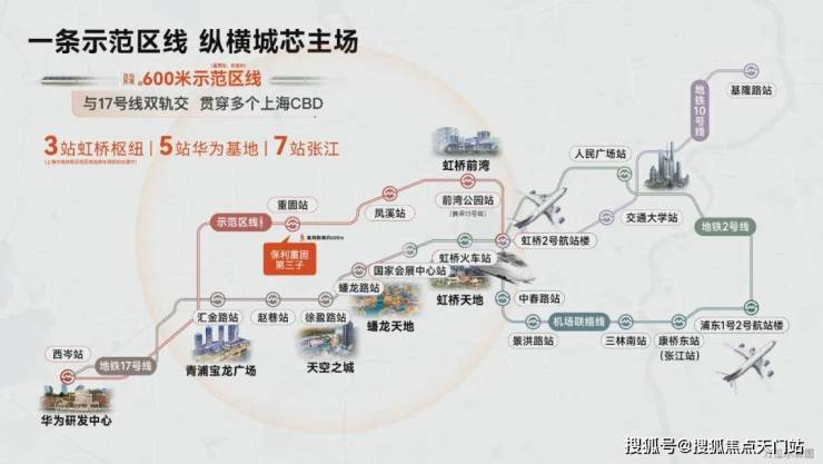 与大虹桥-重固向前进程共振,烫金示范区线在重固设站,距离项目约600米,3站虹桥枢纽、5站华为基地、7站张江,一线串联高能级科创产业高地、长三角一体化示范区等城市重要发展节点,途径科创总值突破千亿级。(信息来源:上海地铁示范区线站点线路图、新华社)