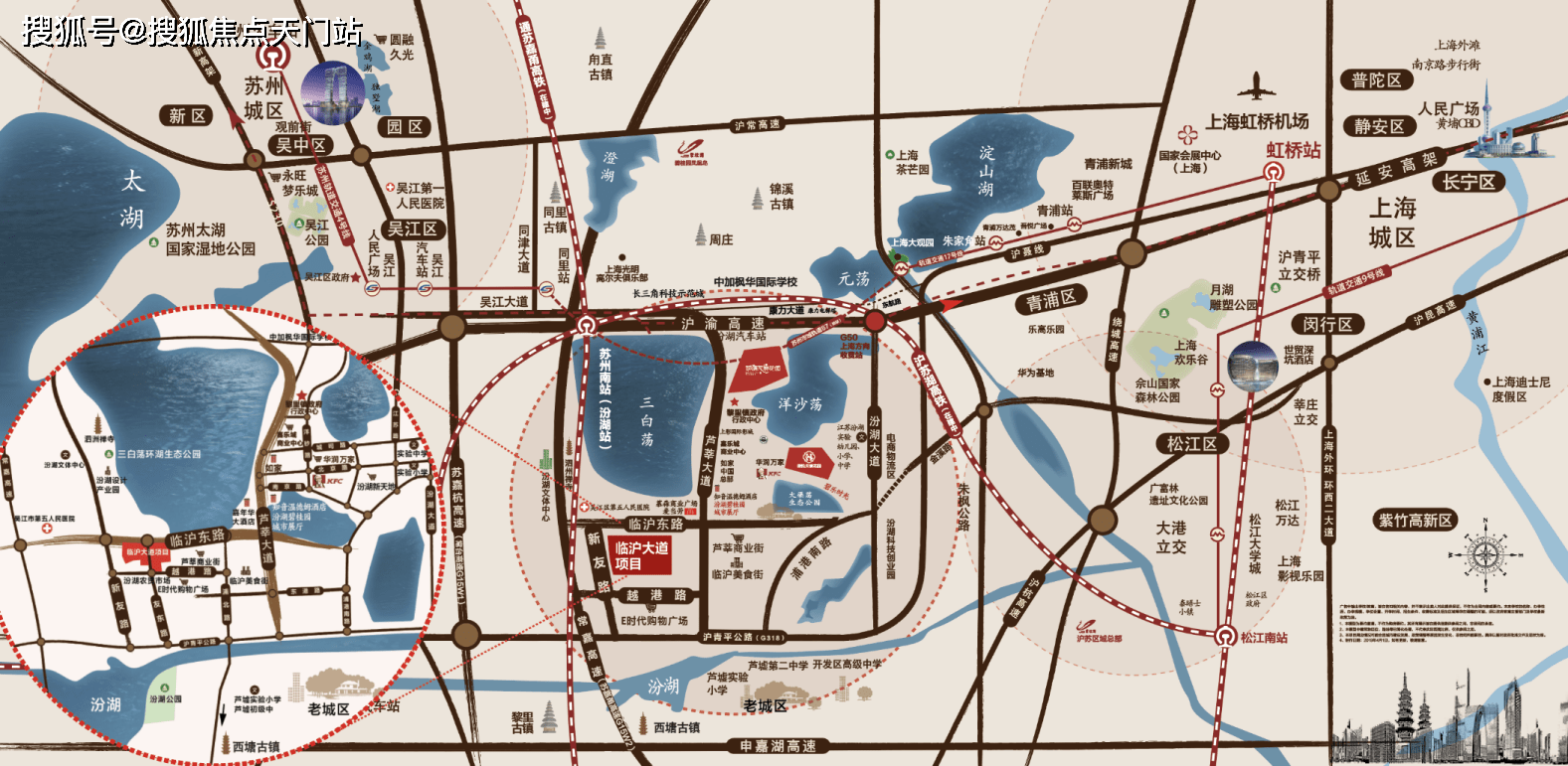 沪苏湖高铁、通苏嘉高铁交汇于苏州高铁南站(汾湖站10号线、嘉善地铁3号线。专线直达大约30分钟到达上海站