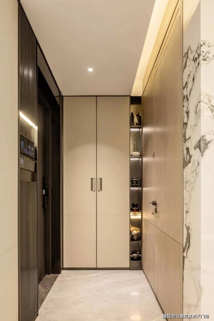 入户门采用手感厚重的 铸铝装甲门+飞利浦智能锁高端系列产品金茂定制柜 设置了玄关造景金属壁龛柜,女王高靴放置区等,大气美观。