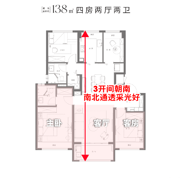 建筑面积约138㎡4房2厅2卫,做到了 3开间朝南+主卧套房设计+南卧带飘窗+卫生间干湿分离 , 空间更加阔绰!