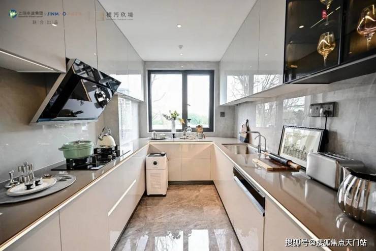 U型厨房带飘窗的设计,左侧预留了 双开门冰箱位置, 让整个空间的利用率更高。交付标准相当奢豪华,配置 西门子的灶台、油烟机、洗碗机高配三件套,弗兰卡的水槽及抽拉式龙头,石英石台面,欧派定制柜柜体,部分金茂定制岩板的墙面等。