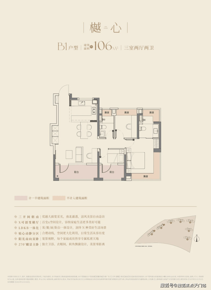 建面约106㎡的三房两厅两卫,3.5开间朝南,南向面宽达到约11.8m!碾压市面上以前的三开间朝南、10米面宽的三房户型。