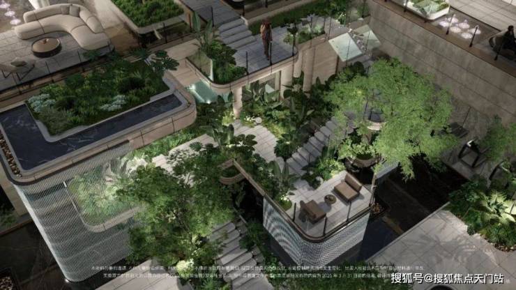 社区景观方面,项目运用室内手法室外化设计构想,将垂直景墙、悬浮观景台与叠水景观立体穿插,形成情随境转的沉浸式体验,自然元素渗透进室内,并与室内空间动态互动。