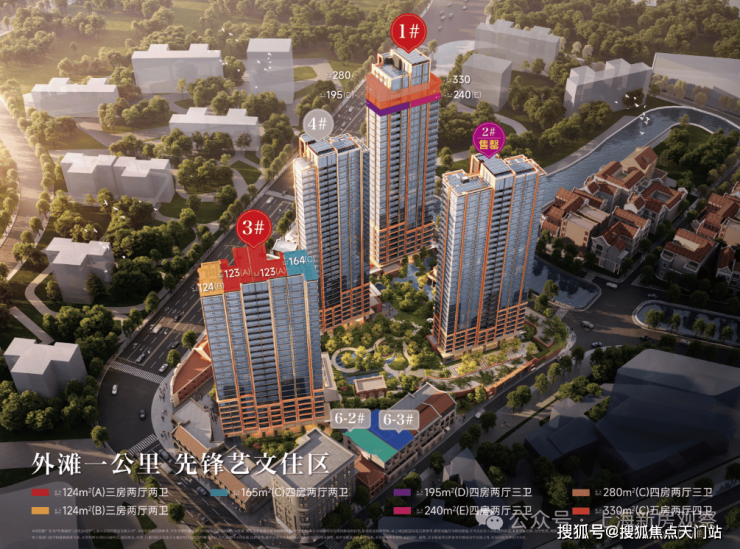 具体来看,1#总高31层,一层架空;2#总高31层,一层架空;4#总高32层,一层架空;3-1#总高24层,一层架空;6为风貌建筑,总高3层,含商业和住宅。在景观设计方面,小区内规划了景观架构、风雨连廊以及下沉式庭院。