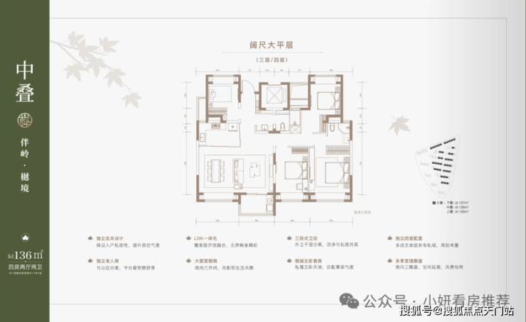 建面约137㎡下叠,四房两厅三卫全能格局,非常适合二娃家庭以及三代同堂。