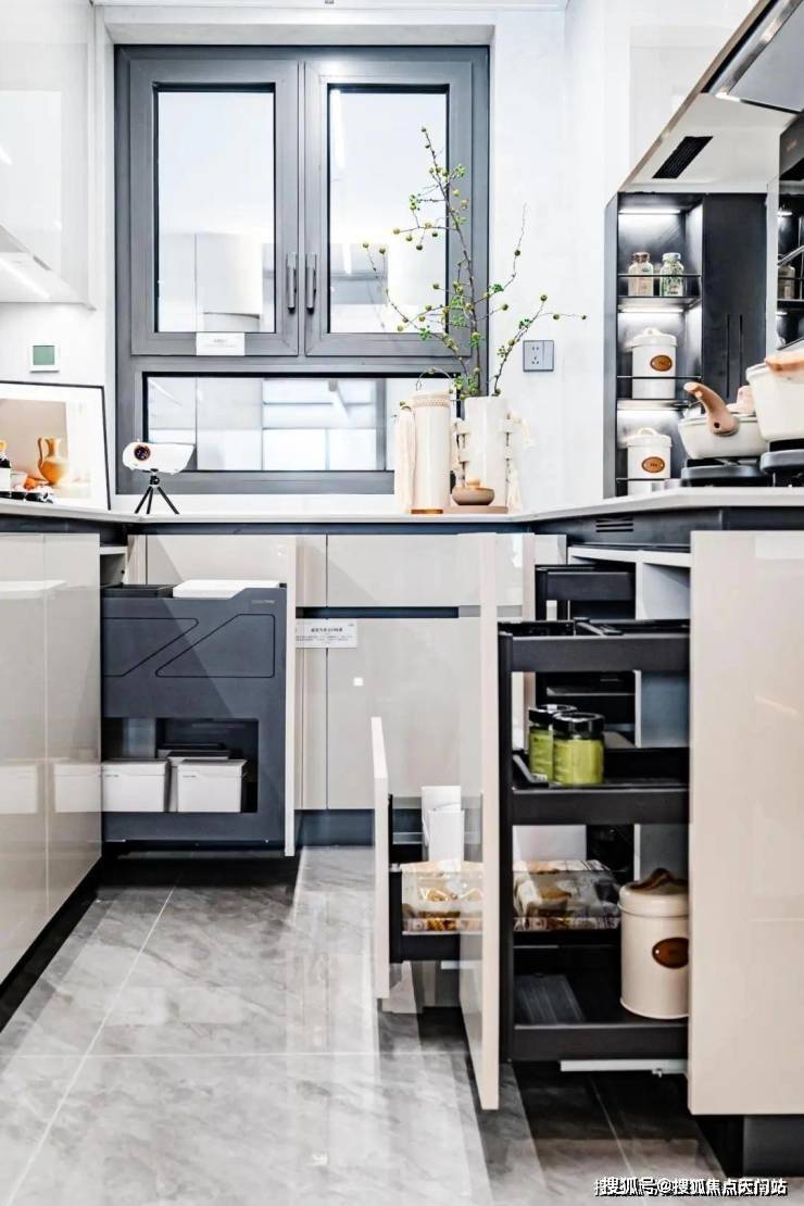 烹饪操作台旁可以轻松放置双开门冰箱,变身全家庭的“美食基地”。橱柜更是化身“百变收纳空间”,柜内设置升降拉篮、多功能调味拉篮、谷物抽、碗碟拉篮,充分利用厨房飘窗打造了操作台面及抽屉,将操作空间及收纳空间进一步放大,灶台旁更是打造了开放式网格收纳空间,而冰箱插座更是采用嵌入式隐形插座,不占用空间。