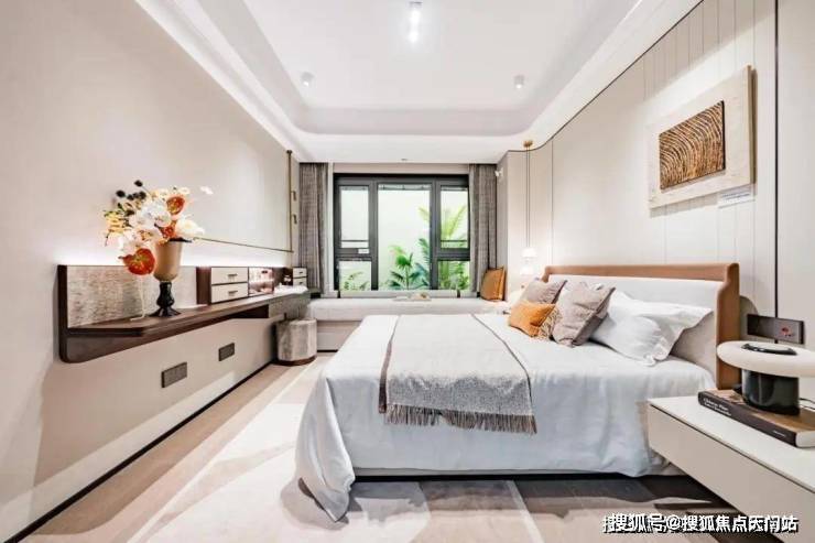南向酒店式套房主卧,温润的木色地板加柔和的背景,入室过道处可打造L型衣帽间或步入式衣帽间,自由切换时尚秀场。敞阔的空间内,足以容纳超大双人床+双床头柜,飘窗处可打造榻榻米休闲区,电动窗帘插座预留、可调节百叶窗等精细设计尽显贴心。
