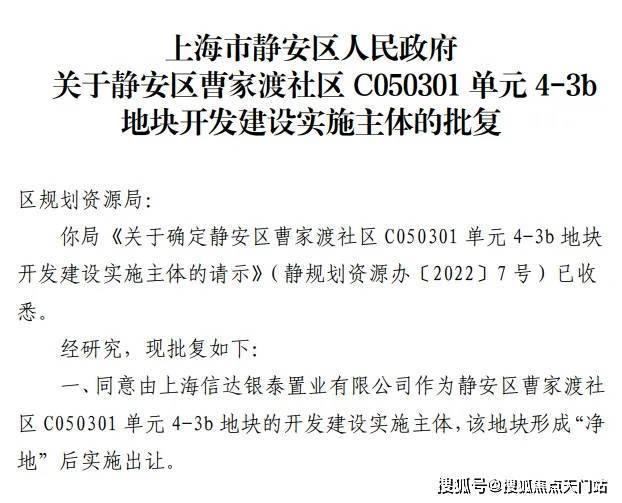 2022年6月,静安区人民政府官宣了曹家渡社区C050301单元4-3b地块的出让公告。